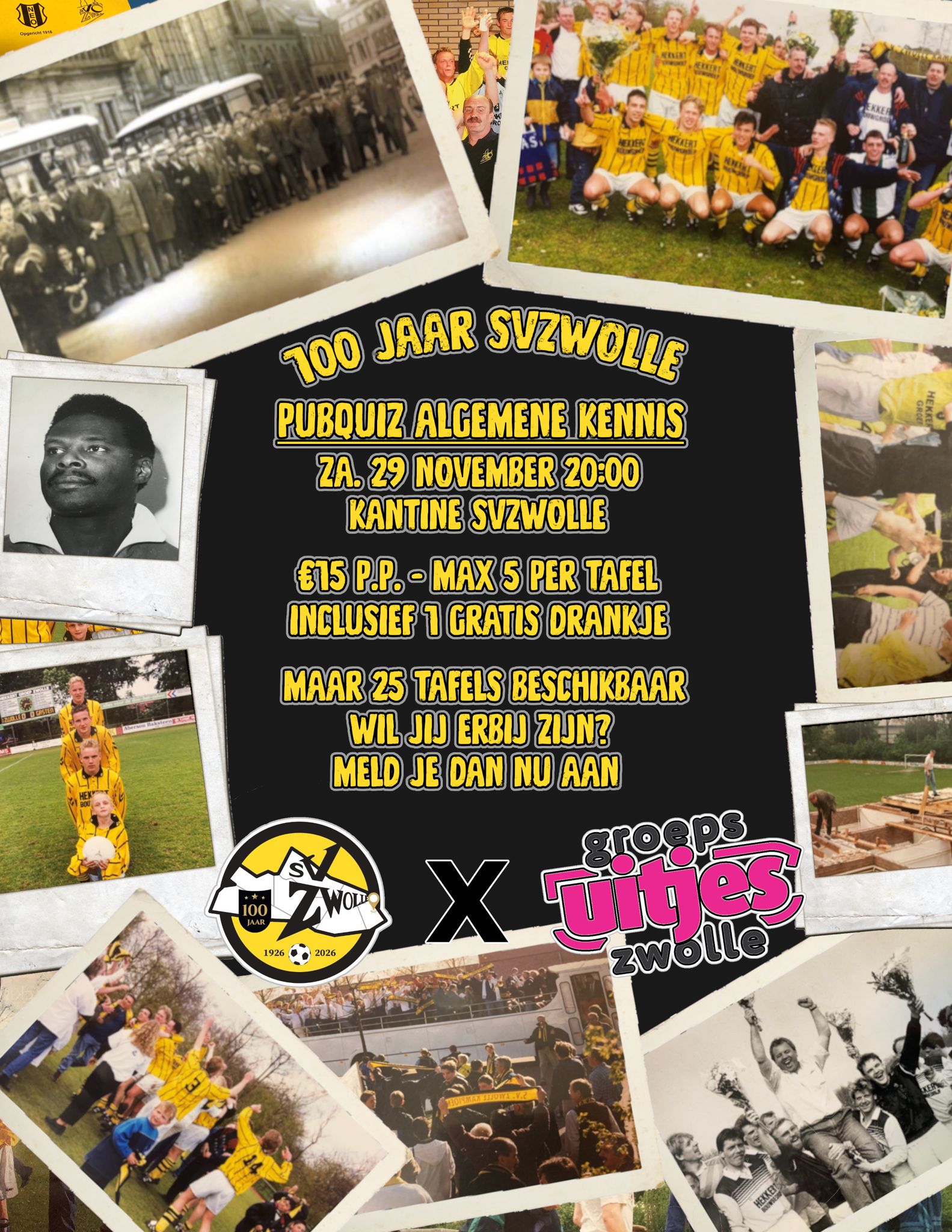 We hebben 29 augustus natuurlijk al de start van het jubileumjaar gehad. Nu staat de eerste activiteit op de planning op zaterdagavond 29 november. Om 20.00 zal er dan een Pubquiz plaatsvinden in de SV Zwolle-kantine met algemene kennisvragen. Deze wordt georganiseerd door onze sponsor Groepsuitjeszwolle.nl.